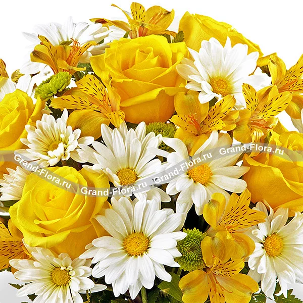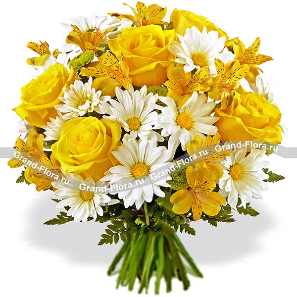 Стандартный: роза желтая - 5 шт., хризантема белая кустовая - 2 шт., хризантема зеленая (сантини) - 1 шт., альстромерия желтая - 3 шт., папоротник - 2 шт.